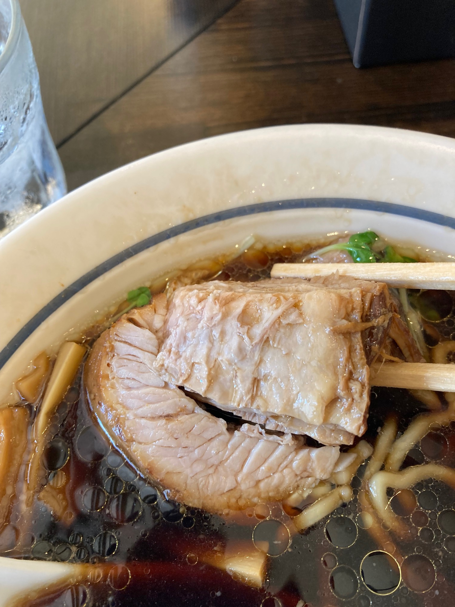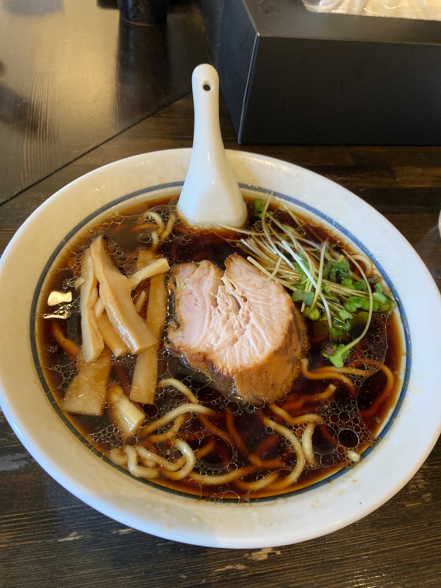分厚いチャーシューが入った黒醤油ラーメンです。